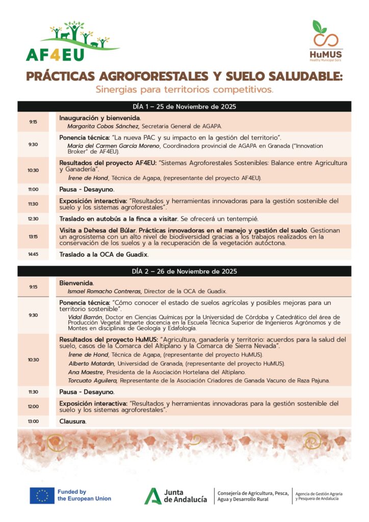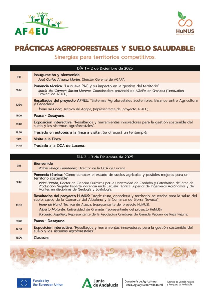 La Agencia de Gestión Agraria y Pesquera de Andalucía (AGAPA), en colaboración con la Consejería de Agricultura, Pesca, Agua y Desarrollo Rural, impulsa durante noviembre y diciembre dos jornadas regionales dedicadas a la salud del suelo y la innovación agroforestal en el marco de los proyectos europeos HuMUS y AF4EU.