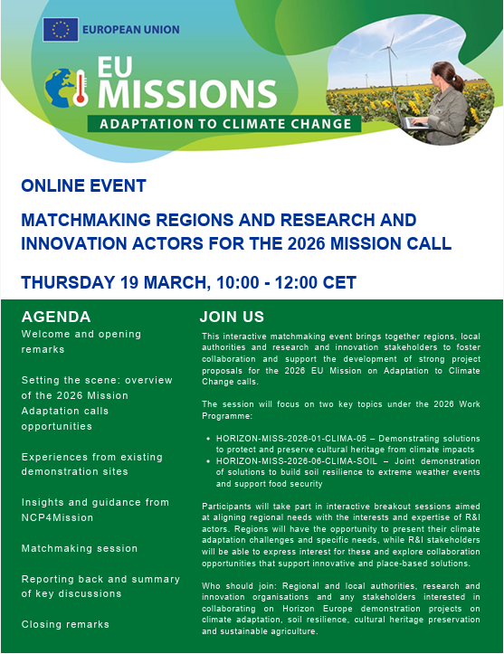 En paralelo, el próximo 19 de marzo de 2026 se celebrará el evento europeo de matchmaking “Matchmaking regions and research and innovation actors for the 2026 Mission call”, organizado en el marco de la EU Mission Adaptation Community. Este encuentro virtual, con requisito de inscripción previa, reunirá a regiones, autoridades locales y actores de investigación e innovación para facilitar la creación de consorcios y el desarrollo de propuestas sólidas en torno a dos ejes prioritarios del programa de trabajo 2026:
