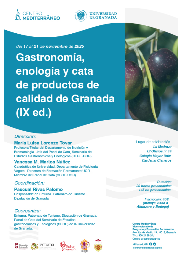 El curso está dirigido por María Luisa Lorenzo Tovar, Profesora Titular del Departamento de Nutrición y Bromatología, y Vanessa M. Martos Núñez, Catedrática de la UGR y Directora de Formación Permanente, ambas miembros del Panel de Cata del SEGE. Además, el programa incluirá sesiones en el Colegio Mayor Cardenal Cisneros y visitas guiadas a la almazara y bodega Señorío de Nevada, donde el alumnado podrá conocer de primera mano los procesos de elaboración y control de calidad.