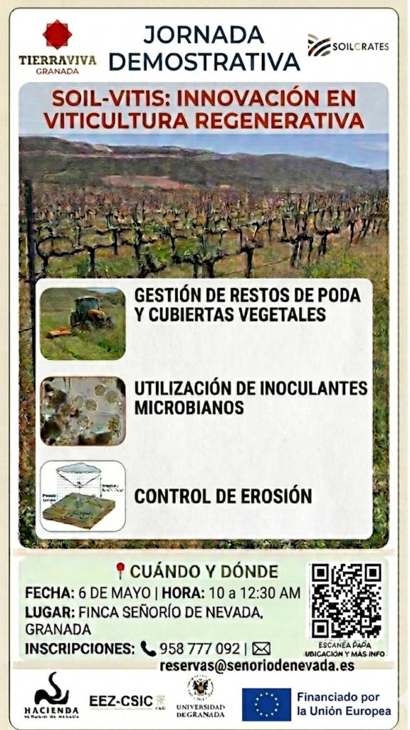 Granada Tierra Viva invita a participar en la jornada demostrativa “SOIL-VITIS: Innovación en Viticultura Regenerativa”, que tendrá lugar el próximo 6 de mayo, de 10:00 a 12:30 h, en la Finca Señorío de Nevada, Granada.