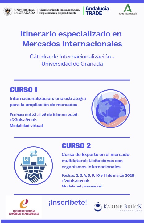 En el marco de las acciones impulsadas desde el Vicerrectorado de Innovación Social, Empleabilidad y Emprendimiento —en el que participamos activamente desde Impronta Granada— se pone en conocimiento de la comunidad universitaria e interesados en general que la Cátedra de Internacionalización, en colaboración con el Vicerrectorado, inicia sus actividades de formación con un itinerario especializado en mercados internacionales.